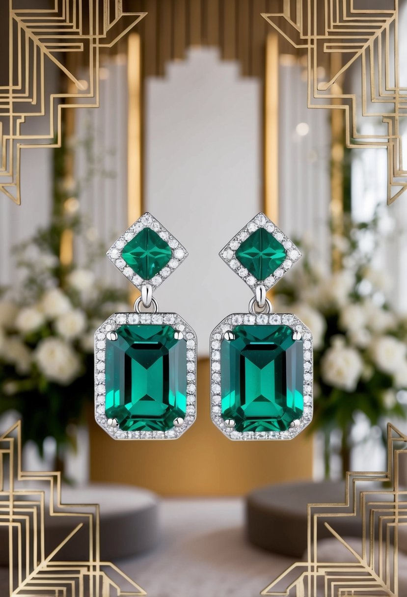 Emerald Art Deco earrings add a touch of glamour to your wedding look. Their vibrant green hues can beautifully complement your bridal gown.