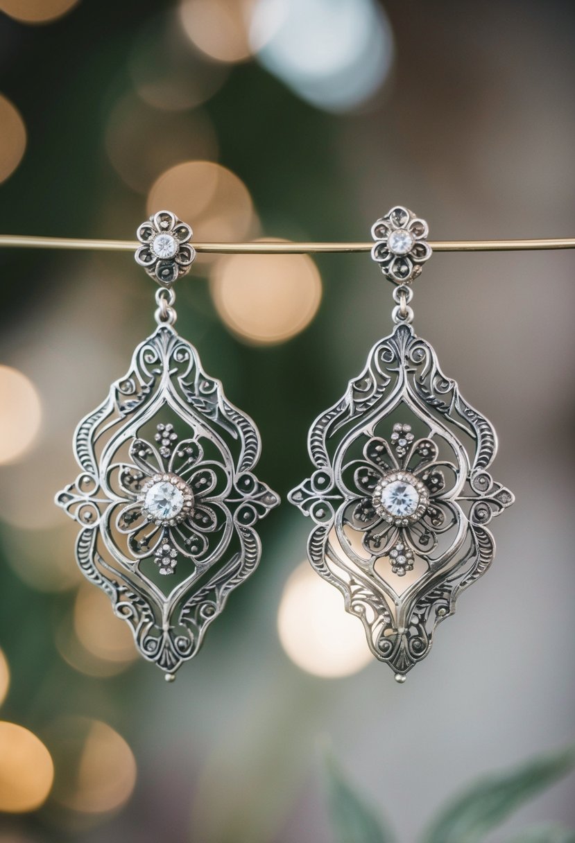 Antique silver filigree designs add a touch of timeless elegance to your wedding look. These earrings feature intricate patterns crafted from delicate silver, giving them a vintage charm.