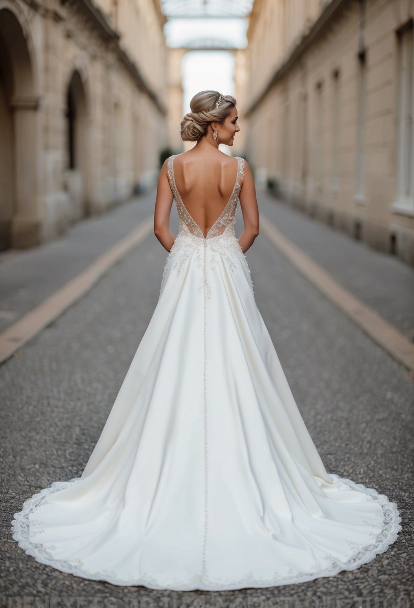 A deep plunge backline adds a stunning touch to any wedding dress. This design showcases elegance while highlighting your back beautifully.