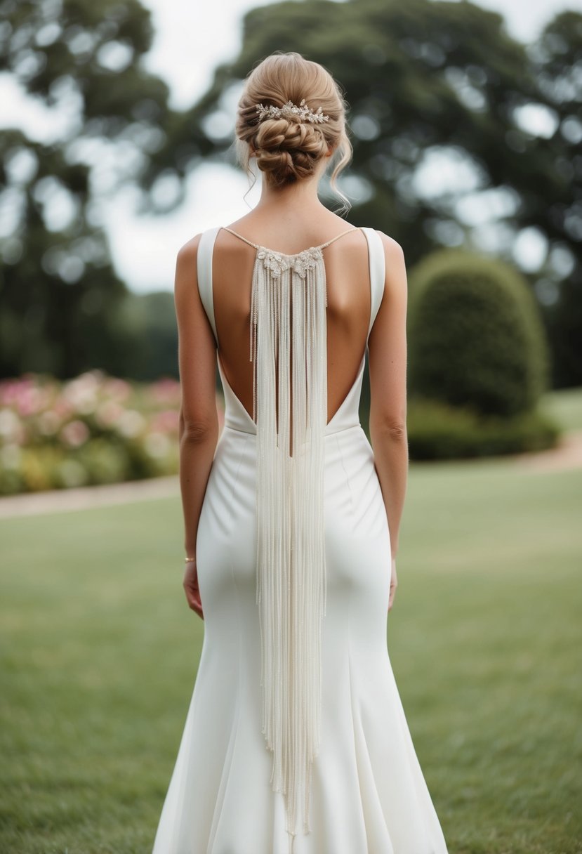 Fringed open back dresses are a fun and stylish choice for your special day. The fringe adds a playful touch that sways beautifully as you move.