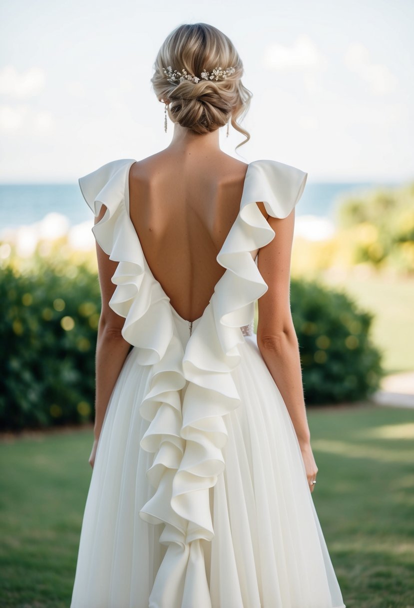 A ruffled open back dress can add a playful touch to your wedding look. The ruffles create movement, making your silhouette look soft and romantic.